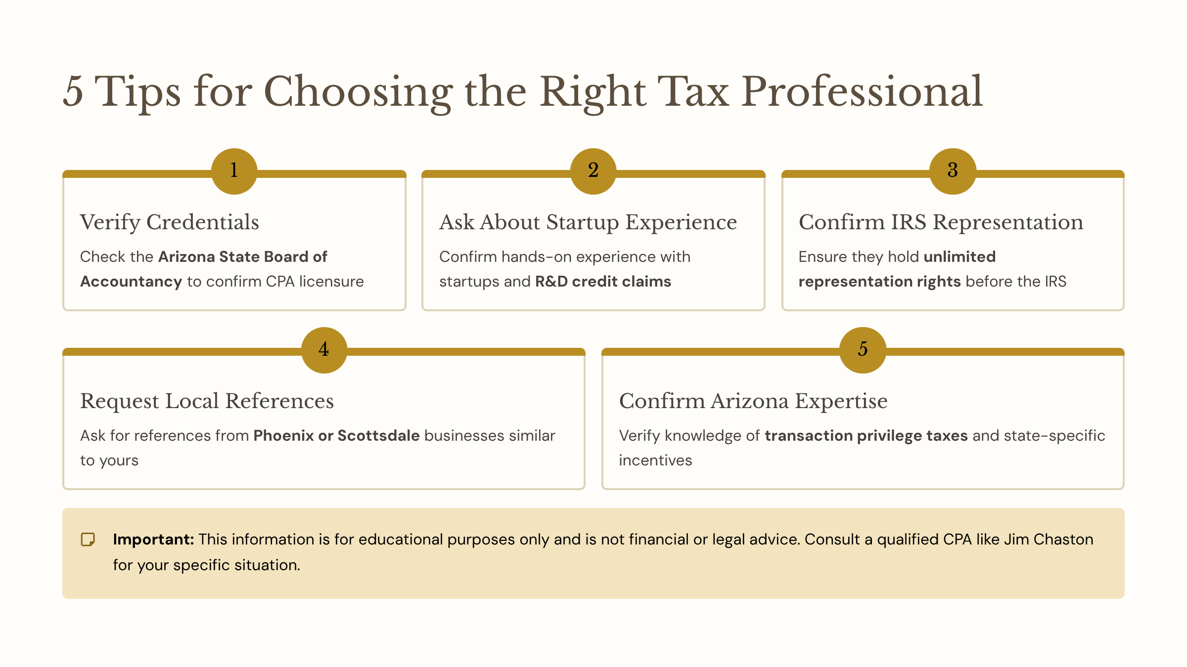 - Ask specifically about experience with startups, R&D credit claims, and Arizona TPT compliance.